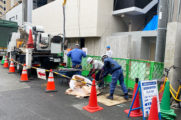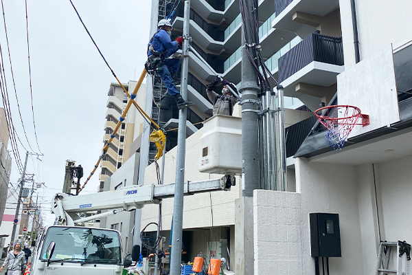 光ファイバーケーブル・同軸ケーブルが通っている電柱から、集合住宅や個人宅に引き込み工事を行います。専用の機器を設置することで、通信を利用できるよう伝送システムの構築を行います。